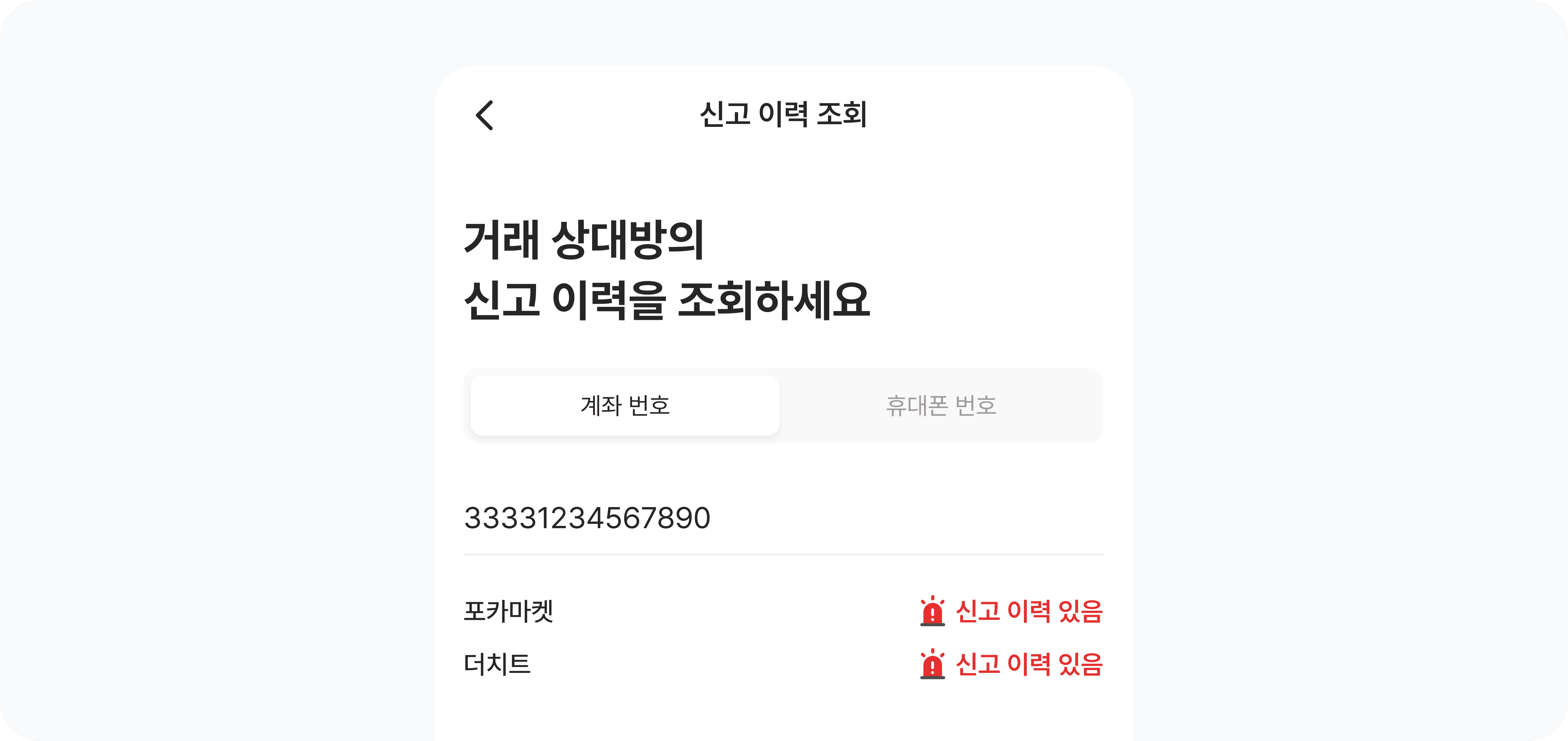[신고 이력 조회]를 통해 상대방의 계좌 번호 또는 휴대폰 번호를 통해 더치트와 포카마켓의 신고 이력을 조회할 수 있으니, 입금 전 참고해주세요!