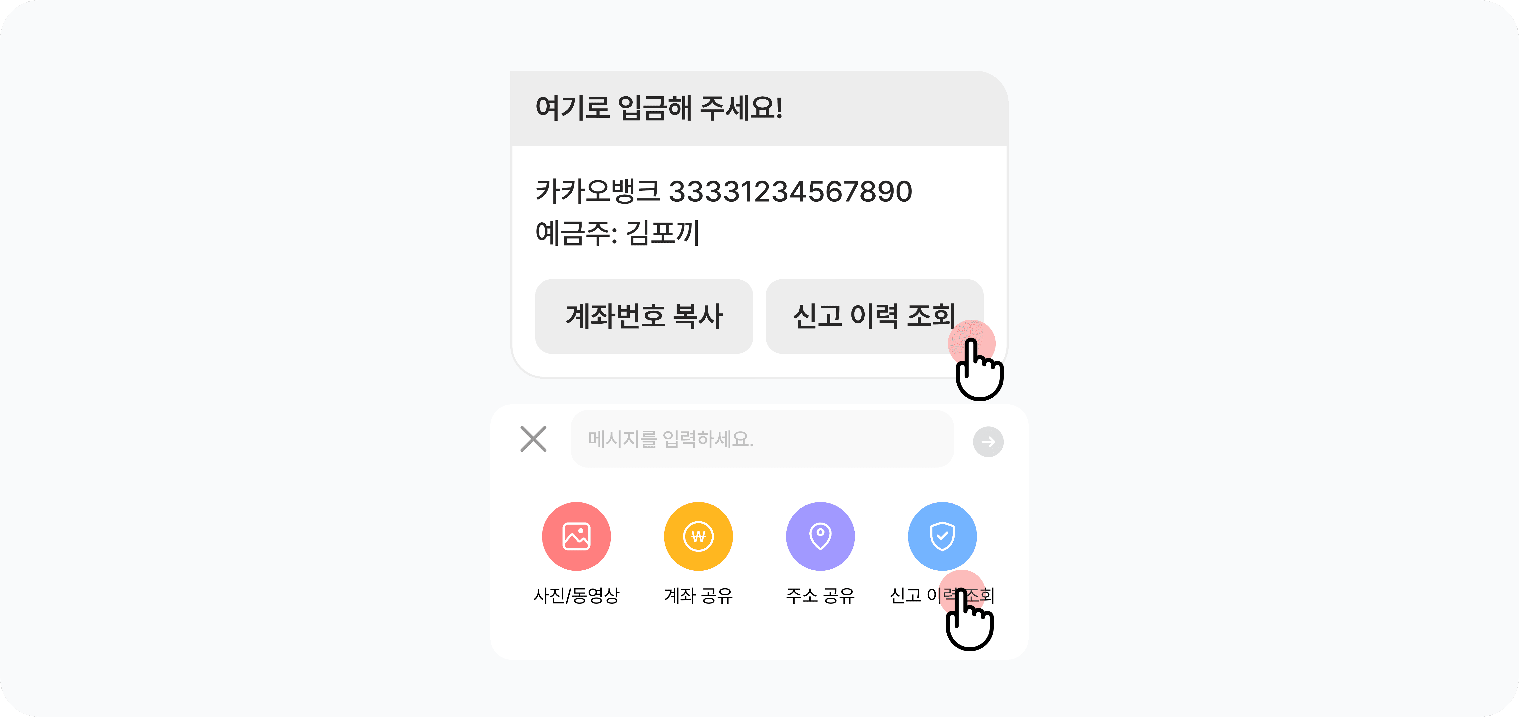 계좌번호를 채팅방에 직접 입력해서 보내는 경우, 본인 명의 계좌가 아닐 수 있어요. 판매자가 [계좌 공유] 버튼을 누르면 본인 인증된 계좌를 공유 받을 수 있으니, 인증된 계좌를 공유받고 안전하게 거래해보세요.