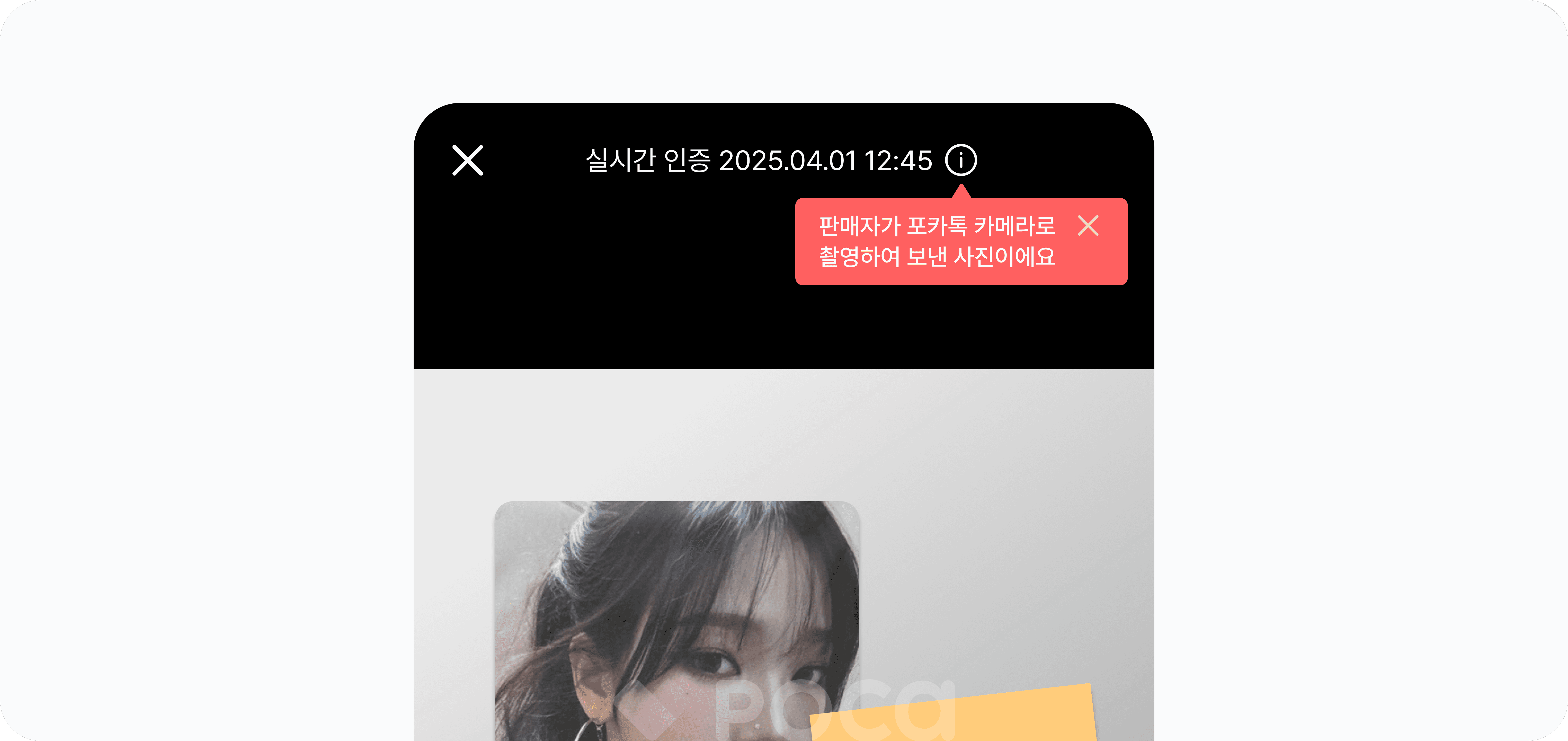 판매자가 포카톡 카메라로 직접 촬영한 경우, 상단에 실시간 인증 표시가 보여요.실시간 인증 이미지를 통해 판매자가 실제로 보유한 포토카드가 맞는지 확인해보세요.