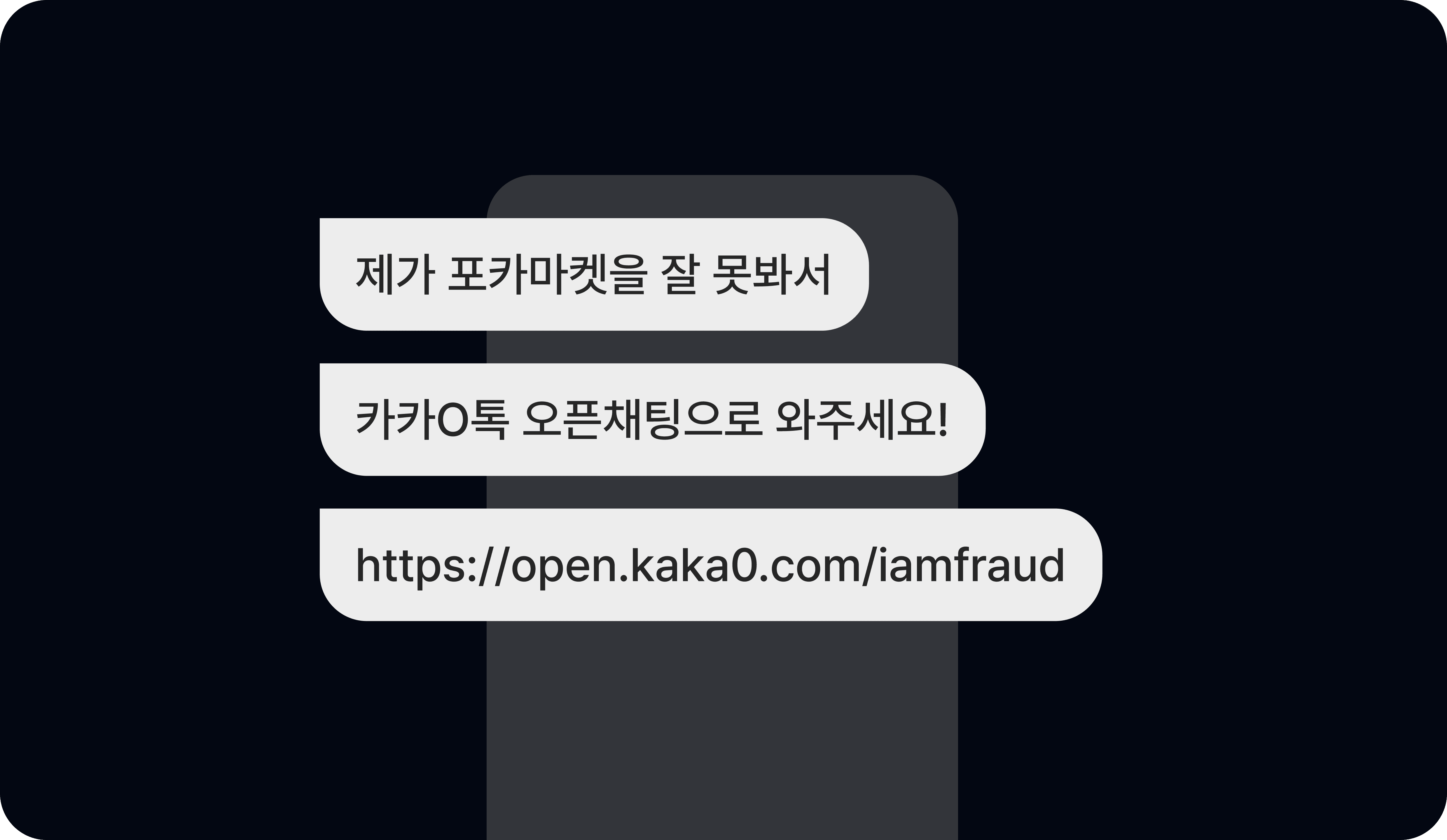 포카마켓이 아닌 외부 채널(카카오톡, 트위터, 문자 등)로 거래를 유도한다면 주의해주세요. "포카마켓을 자주 확인할 수 없어요", "포카톡 알림이 느려요", "영상이나 사진이 잘 안보내져요" 등의 이유로 외부 채널로 유도해 사기 피해가 생기는 사례가 많아요.