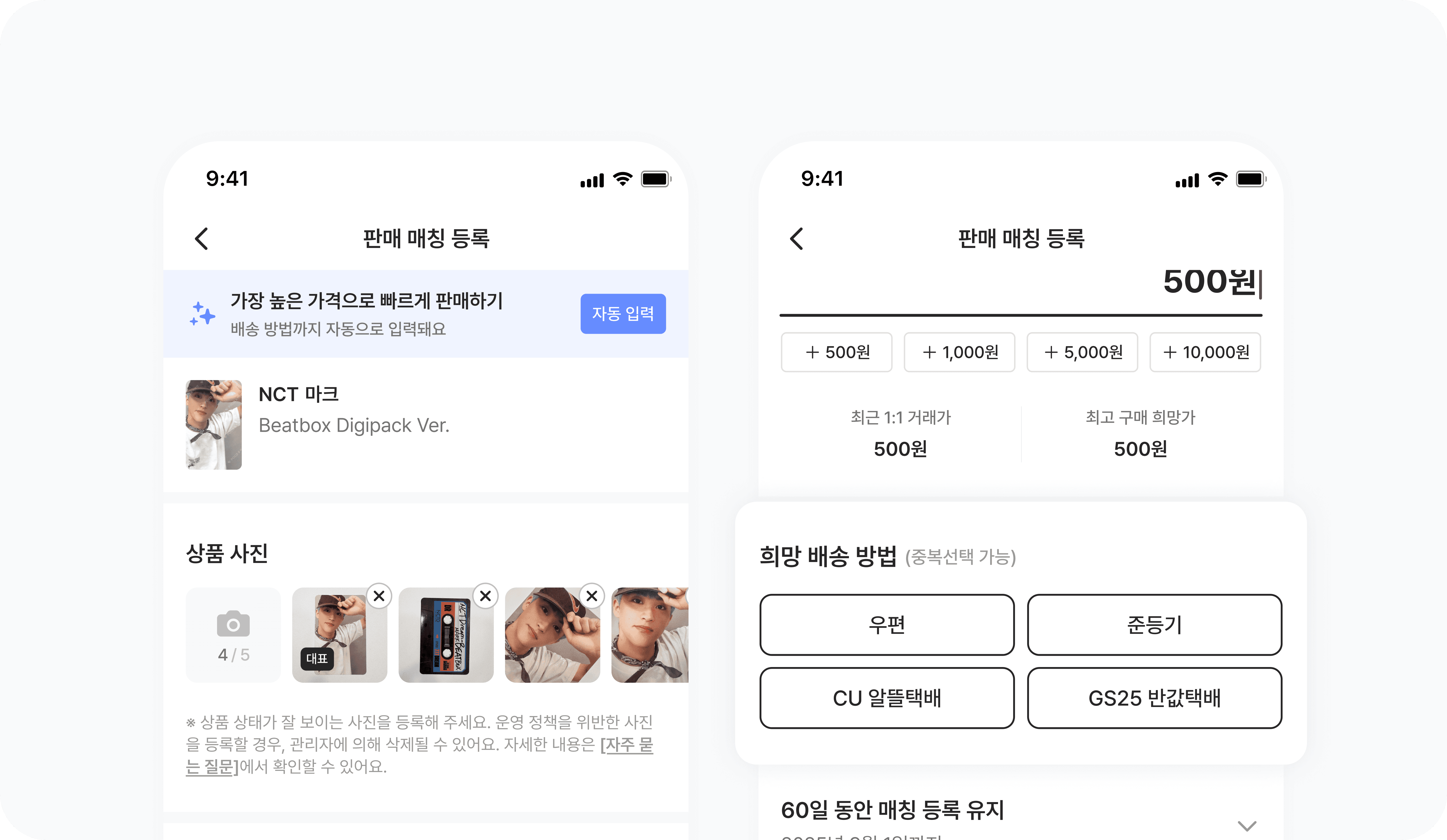 이제 매칭 등록 시 판매자도 원하는 배송 방법을 직접 선택할 수 있어요. 배송 조건이 맞는 구매자와 자동으로 매칭되니까 더 빠르고, 정확하게 거래할 수 있어요.