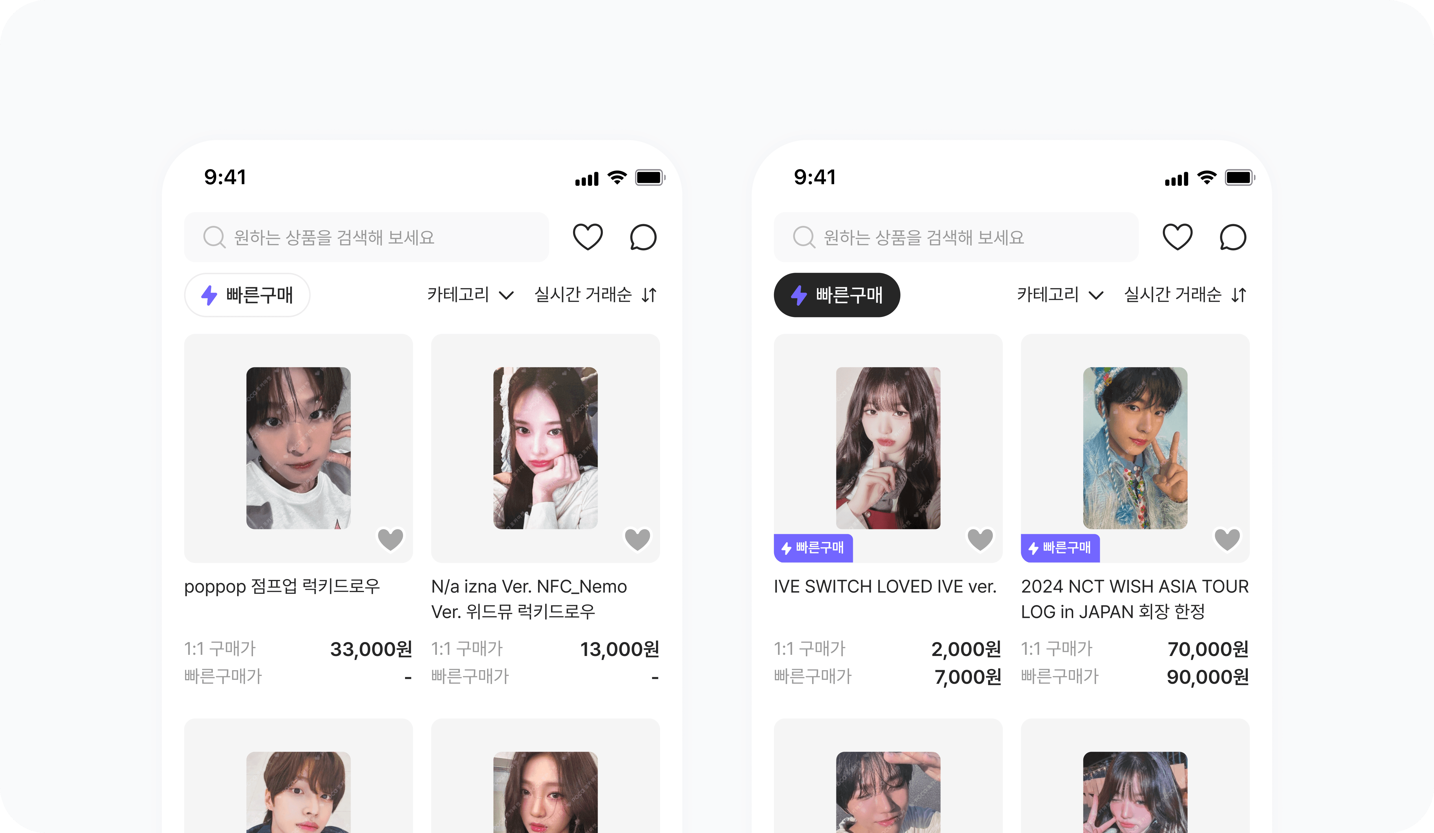 이제 [둘러보기]에서 1:1 거래 상품과 빠른구매 가능한 상품을 한 번에 볼 수 있어요. 리스트에서 [빠른구매] 필터를 누르면 빠른구매 가능한 상품만 볼 수 있어요.