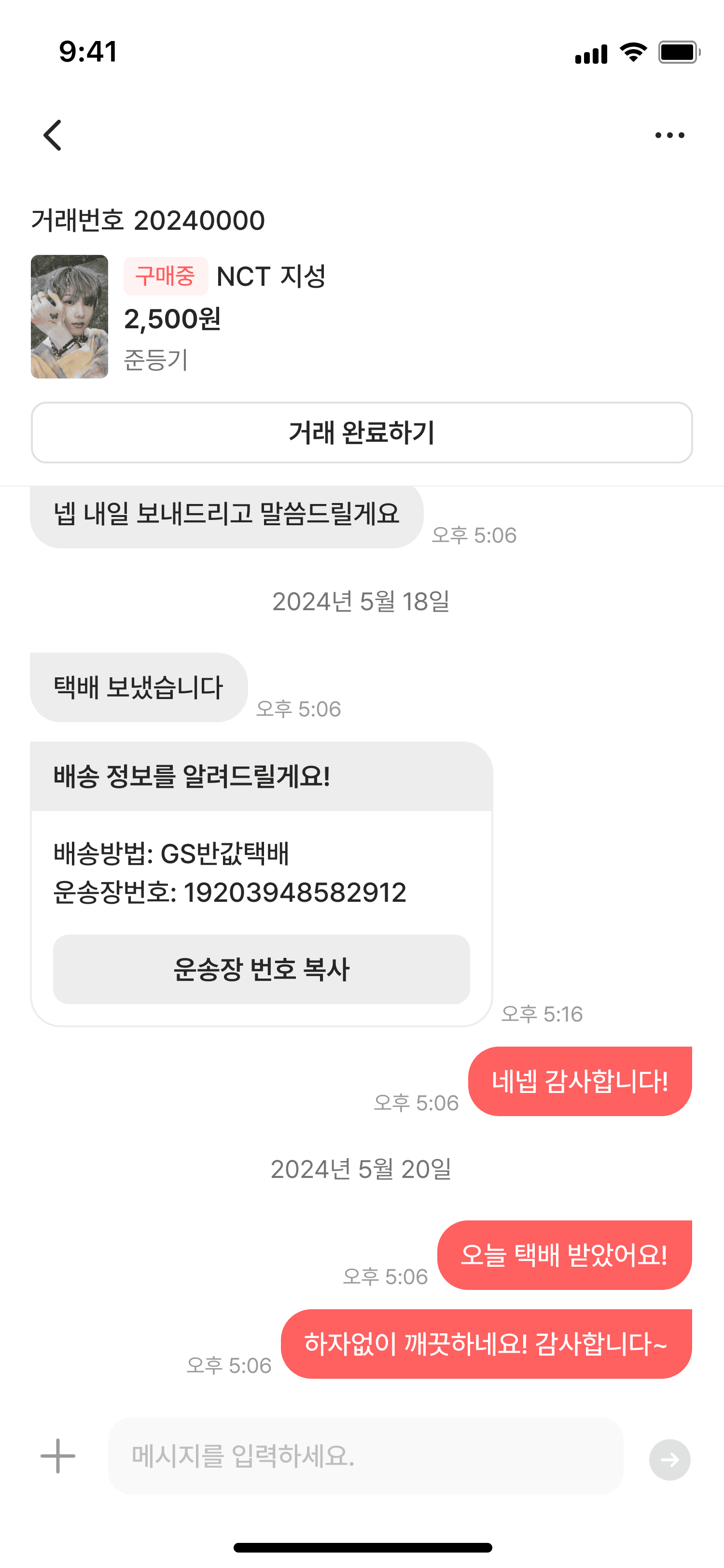 운송장 번호를 공유한 후에 거래를 완료할 수 있어요